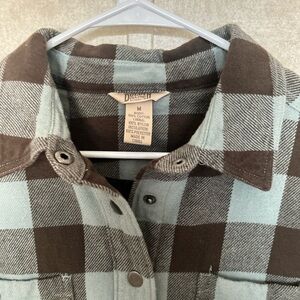 Stay stylish and warm with this plaid button-up jacket. Perfect for layering, this jacket features a classic design in brown and gray tones.
