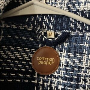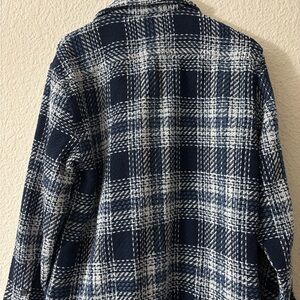 Stylish plaid button-up jacket. Features a classic design with a pocket. Wool, acrylic, and polyester blend.