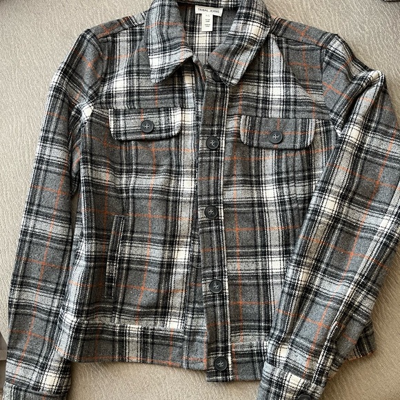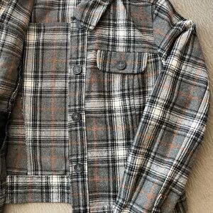 Stylish plaid button-up jacket with a classic design. Features a mix of gray, black, and white colors. Does have pockets!