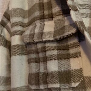 Stylish plaid button-up jacket with front pockets. Features a classic design in neutral tones. Some minor pilling on the interior.