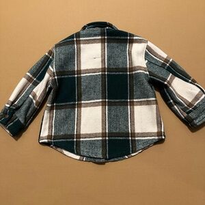 Stylish plaid button-up jacket with chest pockets. Features a mix of green, brown, and cream colors.