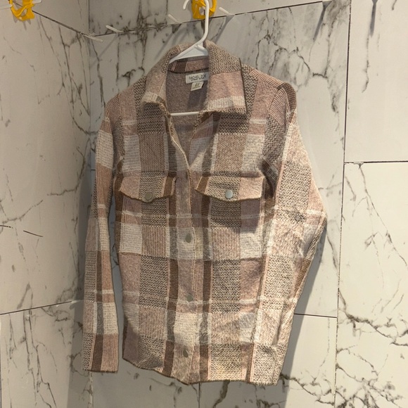 Stylish plaid button-up jacket with front pockets. Features a mix of brown, cream, and tan colors.