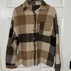 Stylish plaid button-up jacket with a classic design. Features a mix of brown, tan, and cream colors.