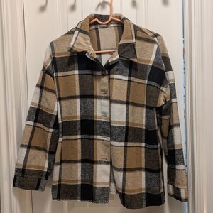Stylish plaid button-up jacket with a classic design. Features a mix of tan, black, and white colors.