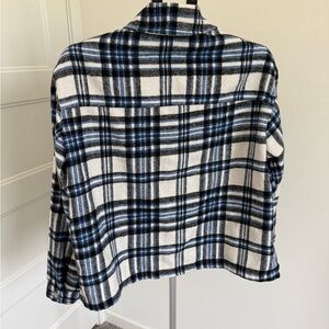 Stylish plaid button-up jacket with front pockets. Features a classic design in black, blue, and white.
