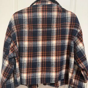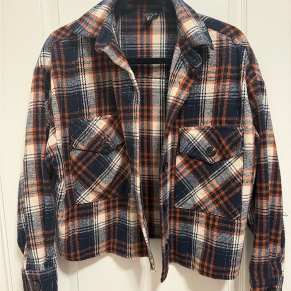Stay stylish and warm with this plaid button-up jacket. Featuring a classic design with a blend of navy, orange, and white colors, it's perfect for any casual outing.