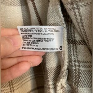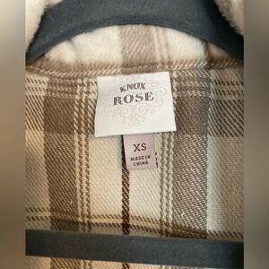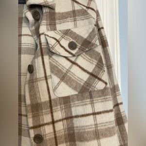 Stylish plaid button-up jacket with front pockets. Features a classic design in beige and brown tones.
