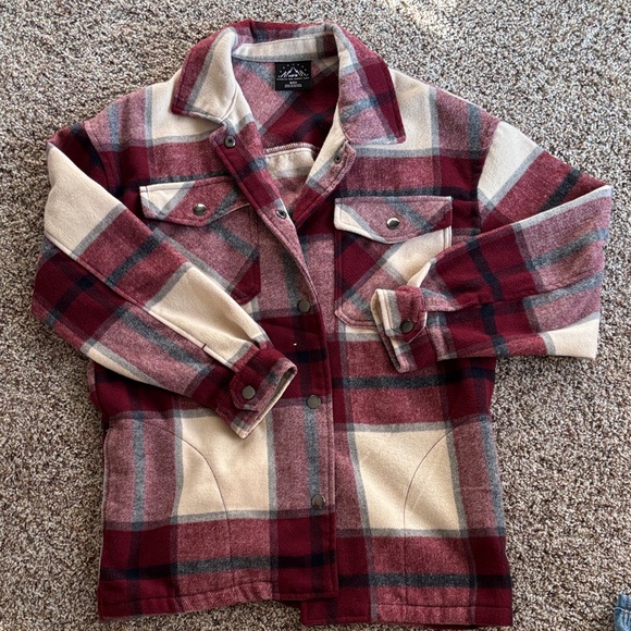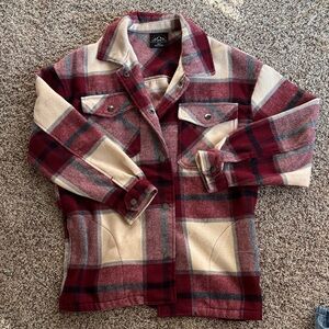 Stylish plaid button-up jacket with chest pockets. Features a blend of red, cream, and gray colors.