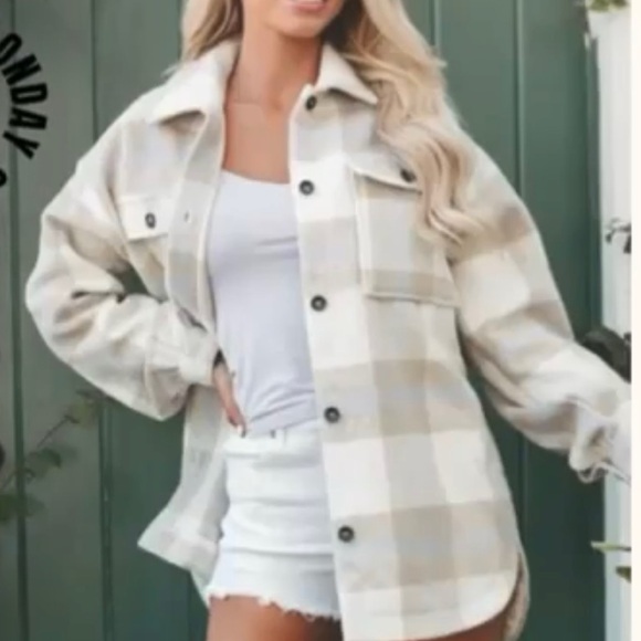 Stylish plaid button-up shacket in neutral tones. Perfect for layering.