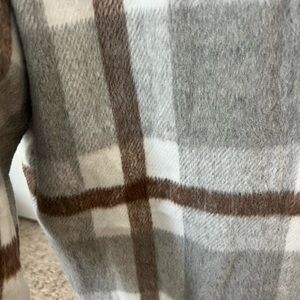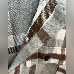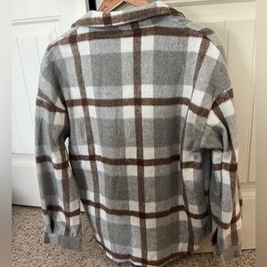 Stylish plaid button-up shirt jacket. Features a classic design with front pockets.