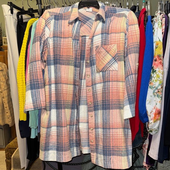 Vibrant plaid shacket with button-up design. Features a blend of warm and cool tones. Features side pockets.