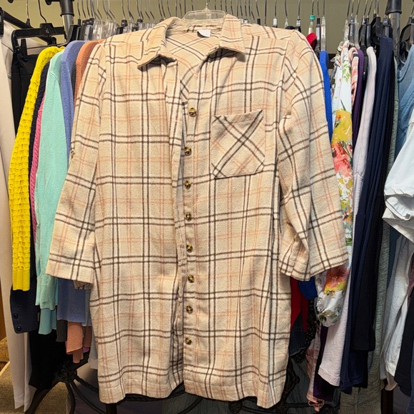 Stylish plaid button down shacket. Features a classic collar and front pocket. Perfect for casual wear. Features side pockets.