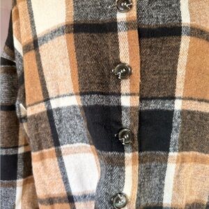 Stylish plaid button-up shacket in brown, black, and white. Perfect for layering.