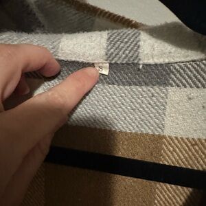 Stylish plaid button-up shirt jacket in mustard yellow, white, and gray. Features front pockets and a classic collar.
