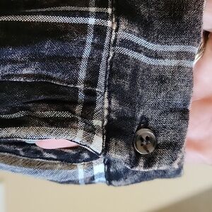 Stylish plaid button-up shirt with a classic design. Features a mix of black, white, and orange colors. Perfect for fall. Wore once, no flaws