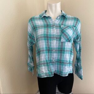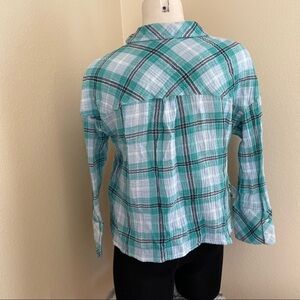 Stay stylish with this plaid button-up top, perfect for any casual outing. The green and white colors add a fresh touch to your wardrobe.