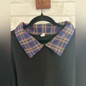 black long-sleeve shirt featuring eye-catching plaid accents on the collar and cuffs. The contrast of classic red-blue-white plaid against sleek black fabric creates a look that’s equal parts edgy and refined. Perfect for layering or wearing solo, this piece blends grunge, prep, and streetwear vibes in one versatile top.