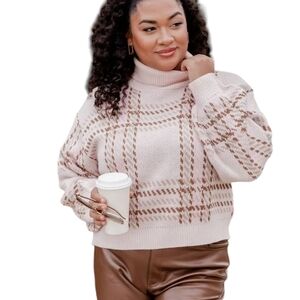 Plaid Cowl Neck Knit Cropped Boxy Sweater Neutral blush Pink and Brown Sz S