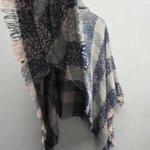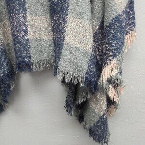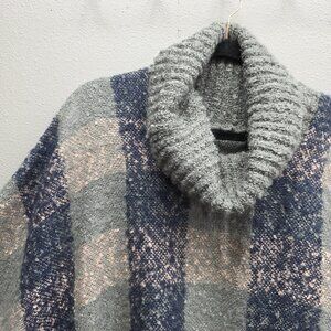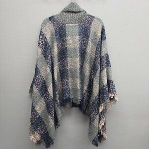 Plaid Cowl Neck Poncho Womens One Size Gray Blue Fringe Knit Shawl Cape Cozy