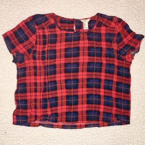 A plain crop top made of a nicer material with a keyhole back and three pleats on each side of the chest. (hits about two inches above jean line, height: 5'2")