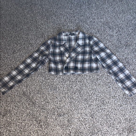 Stylish plaid cropped jacket with button details. Perfect for layering.