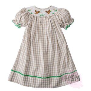 Plaid Embroidered Smocked Mallard Duck Bishop Dress Tan 1622
