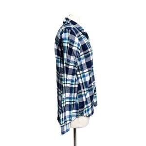 SO blue black and white plaid flannel, soft cotton, button up front and sleeves, displayed on women’s size medium (8-10) dress form, like new overall good condition