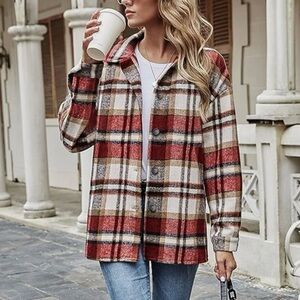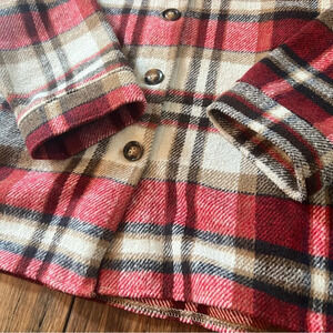 Plaid Flannel Shacket Button Down Jacket Shirt Pockets Red Boho Western Medium