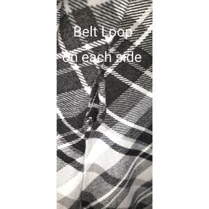 Previously Owned, by ALLISON BRITNEY. Very Soft Flannel Shirt Dress in BLACK & WHITE color. Long sleeves can be down or rolled up a little and buttoned. The bottom is a little longer in length than in front (SEE MEASUREMENTS). This buttons most of the way down but closed at bottom. Belt loop on each side, originally had a belt with it, no belt included.