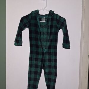 Cozy and stylish plaid one piece for kids. Features a green and black checkered pattern. Perfect for keeping your little one warm and comfortable.