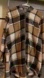 Stylish plaid coat with a hood and zipper. Features a blend of brown, black, and cream colors.