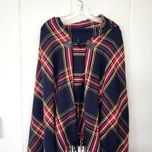 Plaid Hooded Poncho With Fringe & Toggle Closure