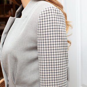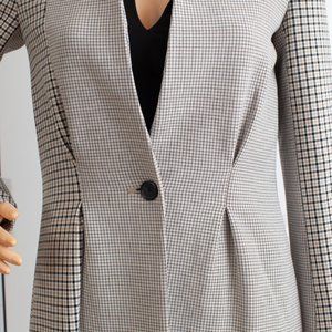 Smartly pairing two different plaid patterns, this coat is enhanced with a unique collar and darting waistline.