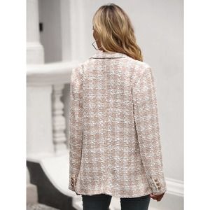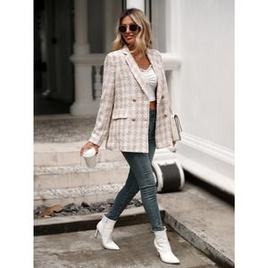 Plaid Lapel Collar Double Breasted Overcoat blazer pea coat cream