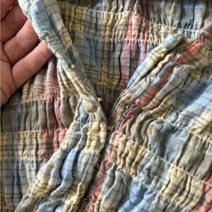 Lightweight plaid shirt with a soft crinkled texture. Ruffled collar and hem details. Clasp hook closure. Pastel multi-color plaid perfect for layering.