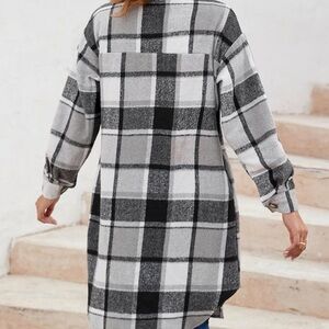 Stylish plaid long shacket coat with button details. Features a classic black and white pattern. Perfect for layering.