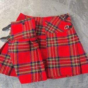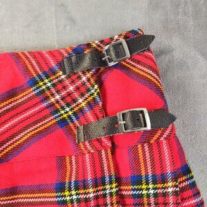 Red plaid mini skirt in a classic tartan pattern, women’s size 28. Features faux leather buckle strap details at the waist and a flared A-line silhouette. Made of 100% acrylic wool. Great for punk, grunge, Y2K, or schoolgirl aesthetic looks.