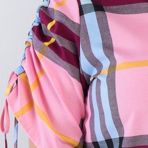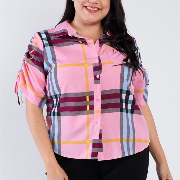 Plaid Multi Stripe Cinched Sleeve Button Down Top