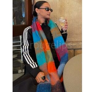 Plaid Multicolor Wide Shawl Scarf With Tassels Fuzzy Knit