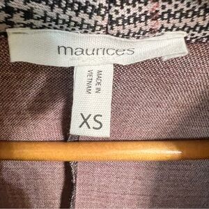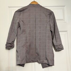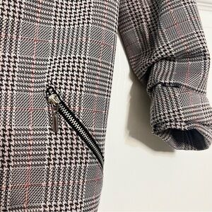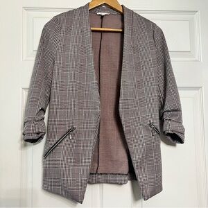 Stylish plaid blazer with open front design. Features zipper pockets for added flair. Perfect for a chic look.