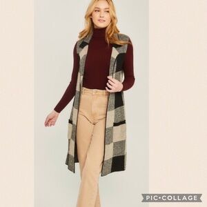 Plaid.. Plaid.. Plaid Black n Cream Midi Cardi Vest. Has small pockets in front. Runs slightly small. 74% Acrylic 17% Nylon 9% Poly