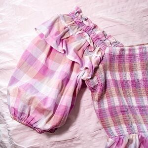 So pretty & flattering on! Fully elastic throughout the midsection as well as elastic on the sleeves. Perfect for summertime! True to Size