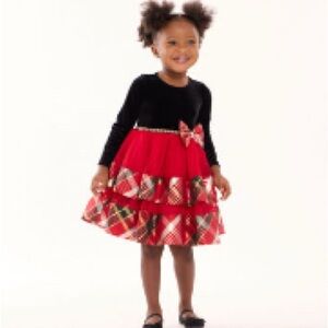 This charming kids costume dress features a vibrant red plaid skirt with a black velvet top. Perfect for festive occasions, it combines comfort and style.