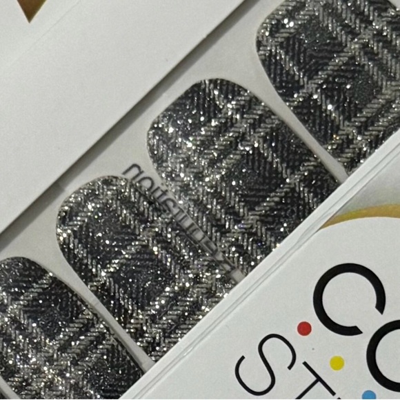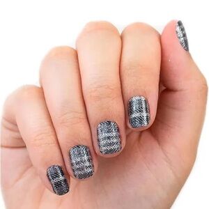 A tartan design in black and silver glitter nail strips.