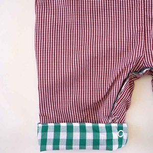 Side Two: Red and White Plaid with Embroidered Truck and Tree. Roll Up the Legs to Reveal the Green and White Plaid Design.