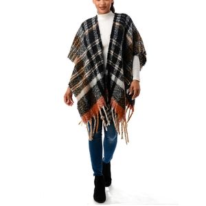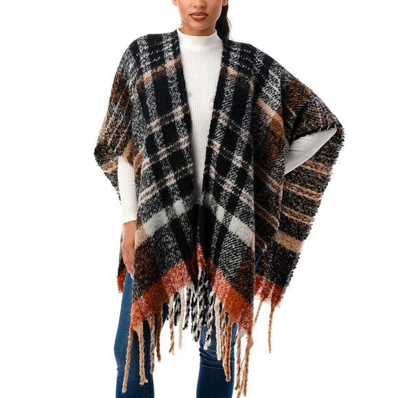Boutique brown and black plaid kimono/ ruana/cape/wrap with fringe trim. 100% Polyester. 35.5 x 60".