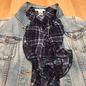 Adorable blue and pink and white plaid blouse. Tuxedo-style ruffle front. Peplum waist. Blue-black buttons. Bundle wth anything else from my closet for 15% off!