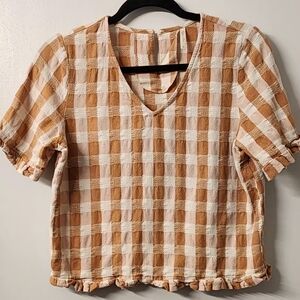 Plaid Ruffle Sleeve Gingham Blouse - Cream and Orange Size XS