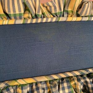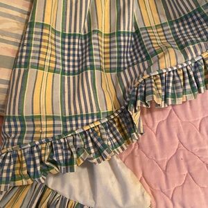 Charming plaid valance with ruffled edges. Features a mix of blue, green, and yellow colors.