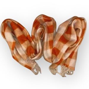 Cozy and snuggly wool feel scarf in a stylish orange and white plaid. This is a great scarf for men or women.